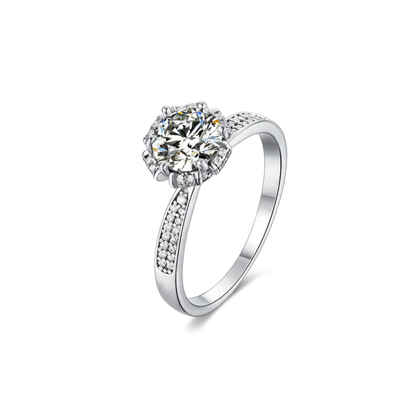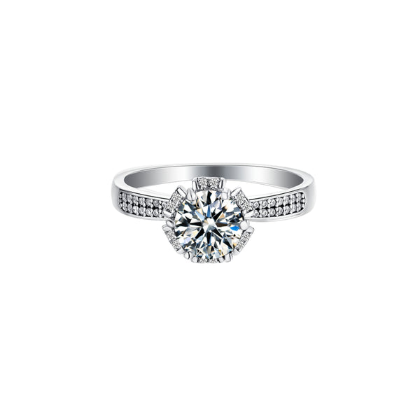 La Regina Which Means The Queen, Is A Breathtaking Ring. The 1ct. Round Moissanite Center Stone Has A Mesmerizing Shine And Is Surrounded By A 6 Prong Crown Base That Transmits An Air Of Luxury & Nobility In A Elegant Way. The 18k White Gold Plated & Pave Band, Has Stunning Micro Moissanite Details That Captivates Everyone's Attention. This Design Is Full Of Details And Unique Finishes, Which Makes It The Perfect Ring For The Queen Of Your Heart.