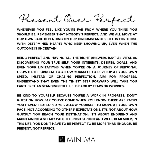 Be kind to yourself because you're a work in progress. Don't question how far you've come when you know there are paths you haven't explored yet. Allow yourself to move at your own pace, not according to others' expectations. It's not about how quickly you reach your destination; it's about enduring and maintaining a steady pace to finish strong and well. Remember, in this life, you don't have to be perfect to be more than enough. Be present, not perfect.